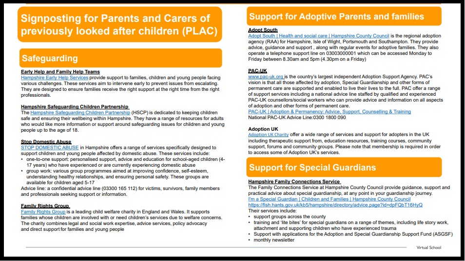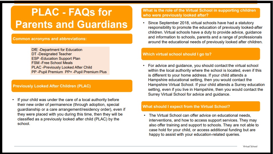 The Virtual School has a statutory duty to provide advice and guidance to parents, carers, schools, education settings and other professionals to promote and improve the educational experiences and outcomes of previously looked after children (PLAC). Hampshire Virtual School provides this service for the families and associated professionals of children attending Hampshire schools, even if the child does not live within the county. If you live in Hampshire but your child attends school in a different local authority, then you should contact the Virtual School in the area that your child is being educated