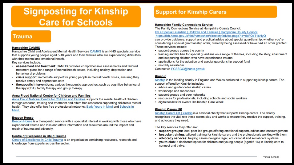 In September 2024, the role of Virtual Schools expanded further to specifically include championing the educational attendance, attainment and progress of children in kinship care.