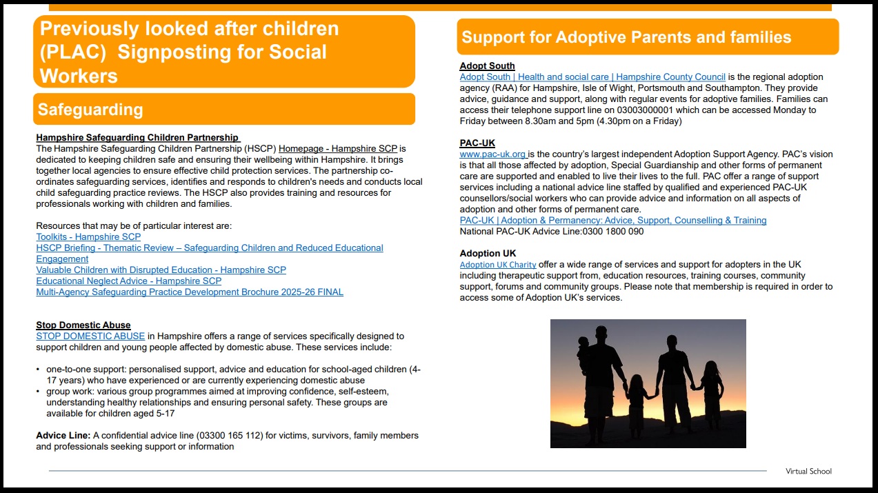Since September 2018, Virtual Schools have had a statutory duty to provide advice, guidance and information to schools, parents and a range of professionals, working to improve the educational outcomes of previously looked after children. The Virtual School promotes a culture of high aspirations, progress and achievements for all our vulnerable children and young people. However, the Virtual School is not the corporate parent for PLAC, so does not case hold these children.