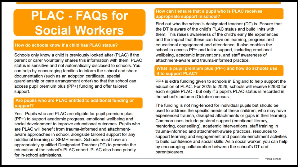 The Virtual School does not work with individual children who have PLAC status - including tracking and monitoring educational progress of individual children and providing academic or other interventions. -