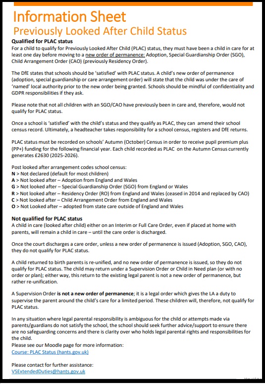 - *Not all children with a special guardianship or child arrangement order will have been ‘looked after’ by a local authority and may not be classified as PLAC. If the order of permanence does not clearly state that the child has previously been in care, schools can contact the relevant post adoption or post SGO team to request this information. Adoption UK suggest that schools can request a letter from the Local Authority where the child was looked after immediately prior to their order of permanence.